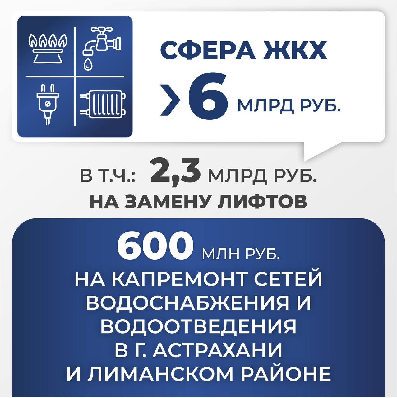 Капремонт сетей водоснабжения и водоотведения в Астрахани и Лиманском районе – 600 млн рублей.