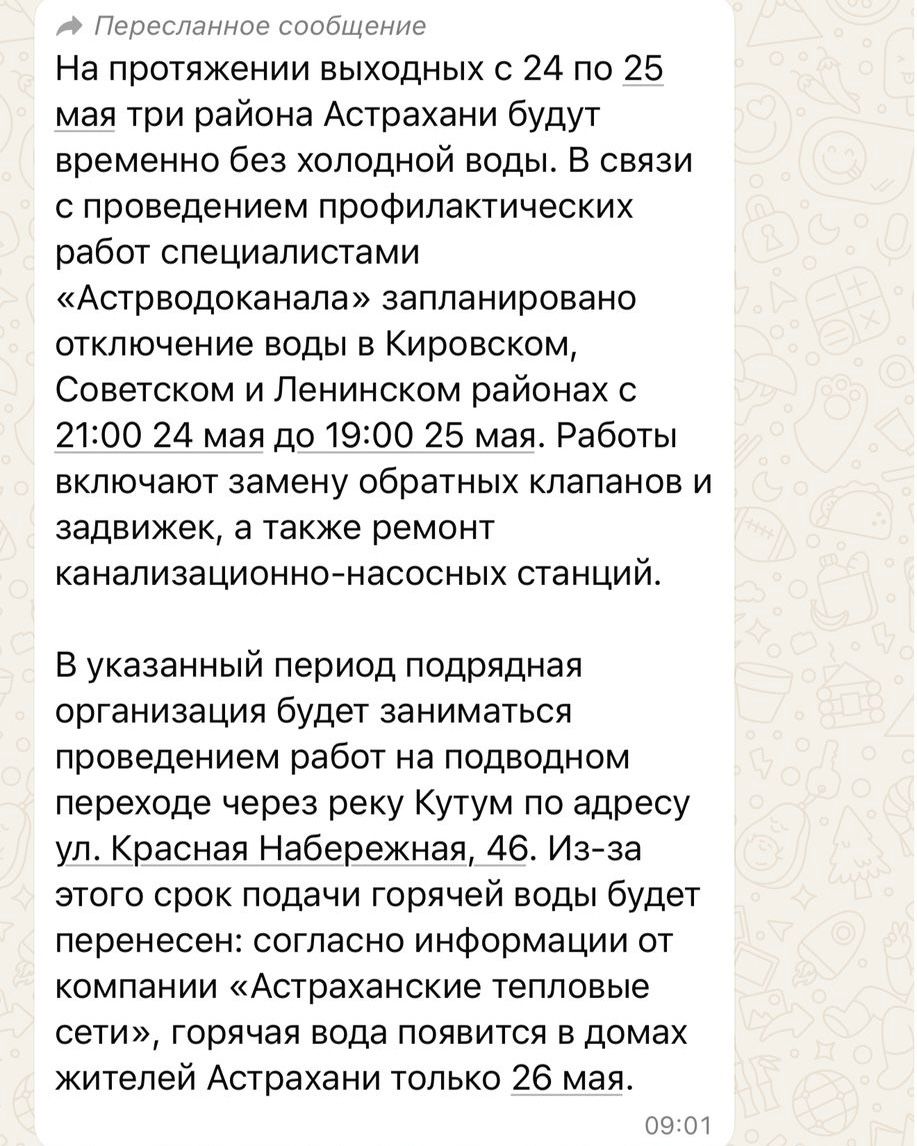 «Уважаемые жители левобережной части города! Распространяется недостоверная информация об отключении холодного водоснабжения 24 мая, – говорится в сообщении «Астрводоканала». – Уточняем, что плановая остановка сооружений проводится только в рамках профилактических работ, МУП «Астрводоканал» заранее уведомит об отключении».