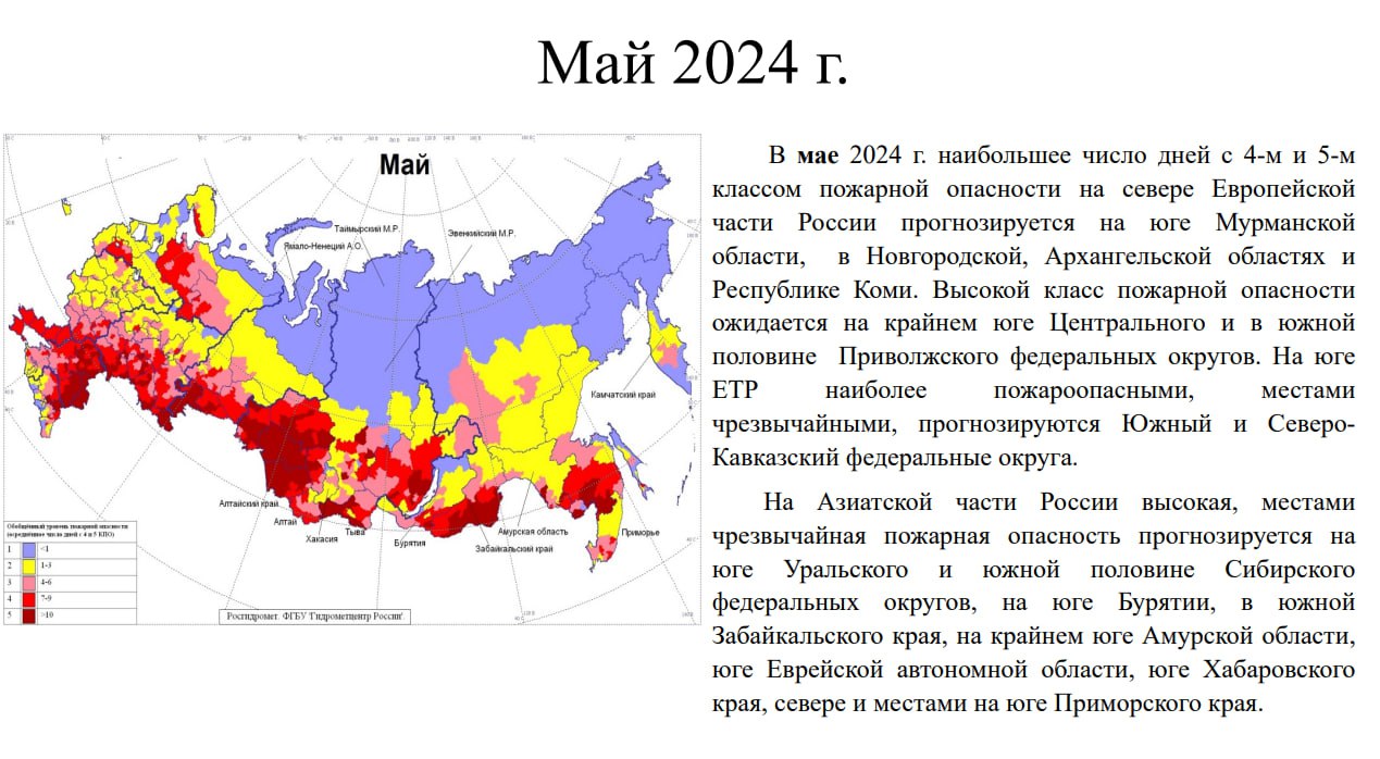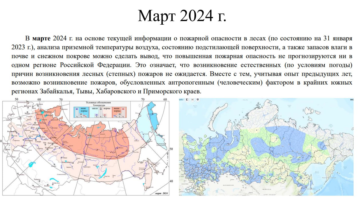Гидрометцентр опубликовал прогноз пожарной опасности в российских лесах с марта по сентябрь 2024 года. В нём учитываются данные о снеговом покрове, промерзании почвы, метеорологических условиях и данные о пожароопасности в лесах за последние 12 лет. Прогноз грустный — начиная с апреля в ряде районов ожидаются высокий и чрезвычайный классы пожарной опасности.