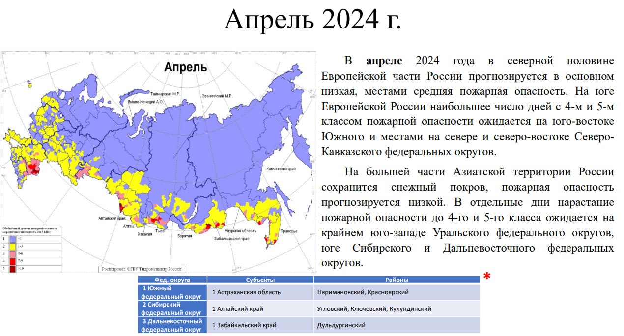Так, уже в апреле на юго-востоке Южного и местами на севере и северо-востоке Северо-Кавказского федеральных округов прогнозируется средняя пожароопасность. Наиболее высокий класс возникновения возгораний — у Астраханской области.