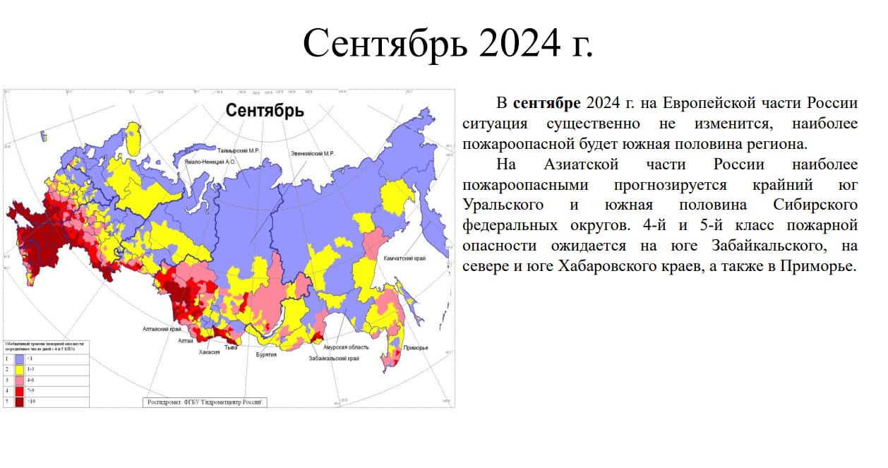 В июне, июле, мае и сентябре высокая и чрезвычайная пожароопасность (4 и 5 классов) сохранится практически во всех субъектах ЮФО и СКФО. При этом, согласно климатическим данным,