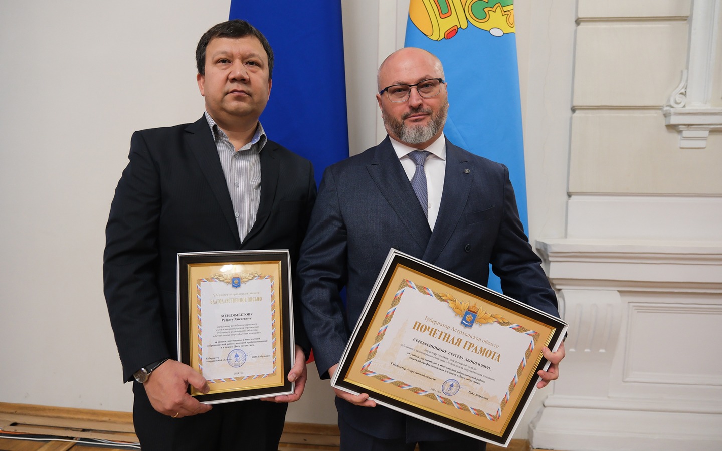 В резиденции губернатора Астраханской области прошло торжественное мероприятие в честь Дня энергетика. Губернатор Игорь Бабушкин вручил почетные грамоты и благодарственные письма лучшим специалистам отрасли. Среди награжденных оказались сотрудники ПАО «Астраханская энергосбытовая компания» Сергей Серебренников, директор по сбыту электрической энергии, и Руфат Менлямбетов, начальник службы коммерческого учета и введения режима ограничений.
