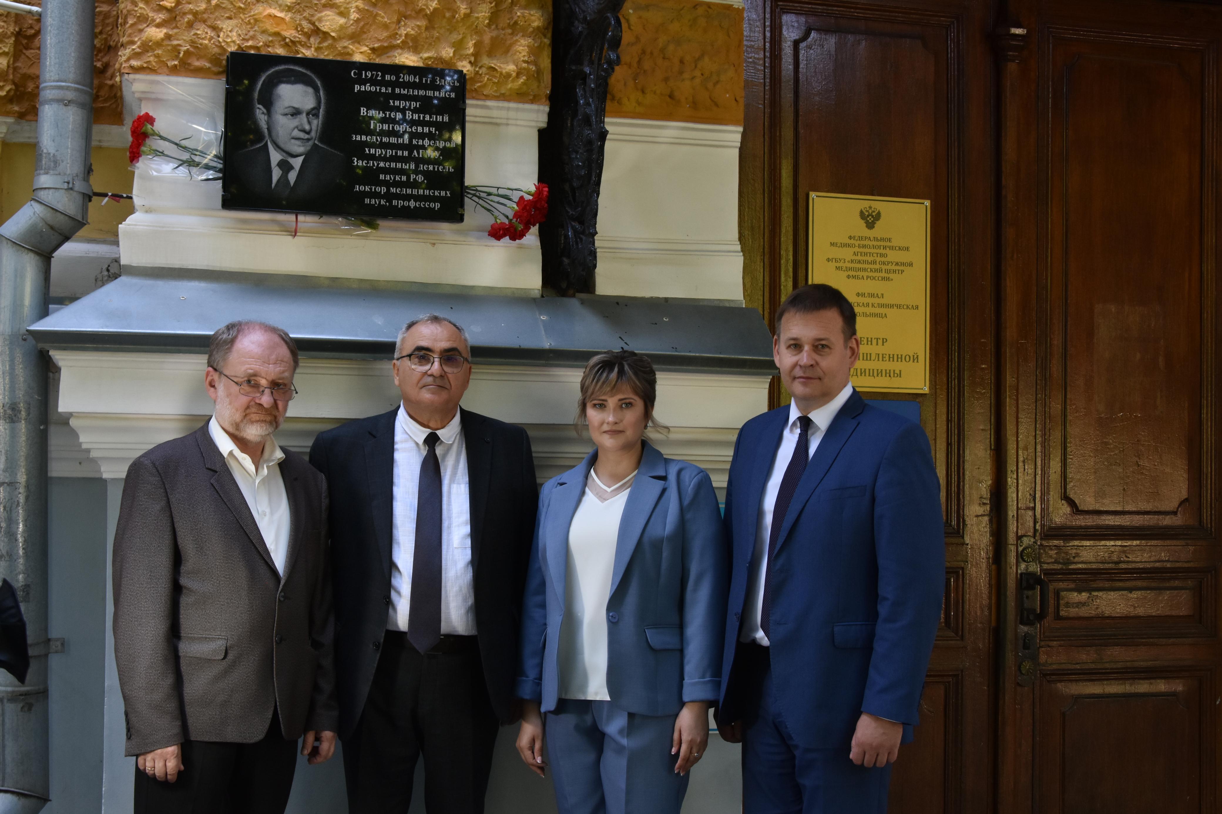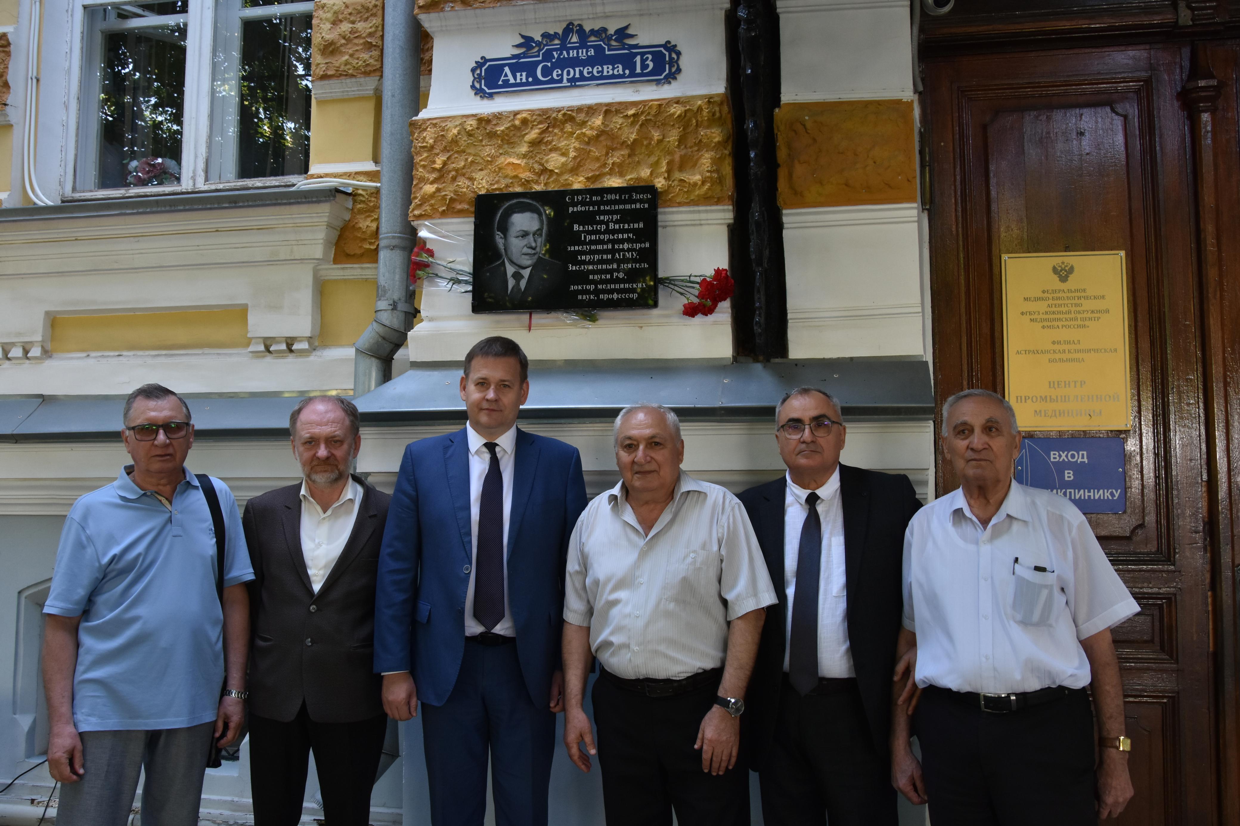 В Астрахани открыли мемориальную доску в память о профессоре, гениальном хирурге, докторе медицинских наук, Виталии Григорьевиче Вальтере, чья жизнь более 30 лет была неразрывно связана с Астраханской клинической больницей ЮОМЦ ФМБА России. Мероприятие приурочили к празднованию векового юбилея медучереждения.