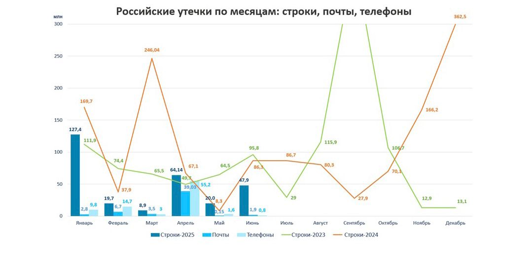 Интересно, что, если по итогам 2024 года лидером по количеству утекших строк данных был кредитно-финансовый сектор, то в первом полугодии 2025 года пальму первенства перехватил госсектор. Однако аналитики Solar AURA выявили, что многие «утечки» госструктур на самом деле являются компиляцией старых, давно скомпрометированных данных из различных источников, собранных за несколько лет. Поэтому важно отметить, что проверять информацию на подлинность.