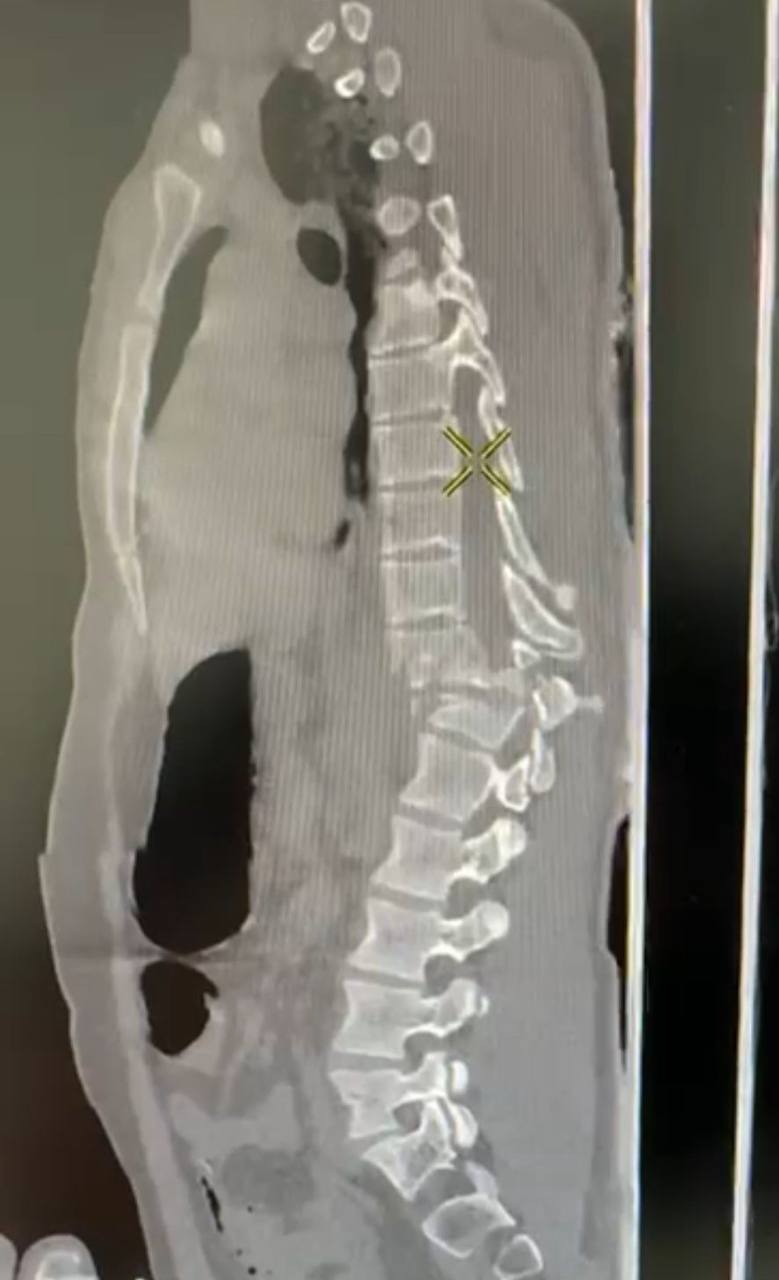 Компьютерная томография выявила не только оскольчатые переломы грудных и поясничных позвонков, но и перелом ребра, ушибы легких, а также пневмоторакс. Однако самым серьезным последствием стало повреждение спинного мозга, приведшее к параличу ног и нарушению работы тазовых органов. Пациент испытывал настолько сильную боль, что нуждался в мощных обезболивающих препаратах.