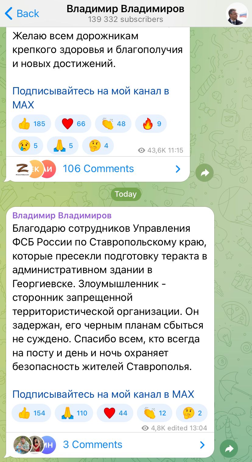«Благодарю сотрудников Управления ФСБ России по Ставропольскому краю, которые пресекли подготовку теракта в административном здании в Георгиевске. Злоумышленник — сторонник запрещенной террористической организации. Он задержан, его черным планам сбыться не суждено», — написал губернатор в своем Telegram-канале.